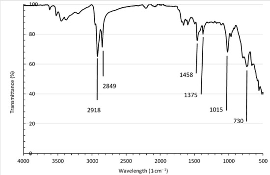 The spectrum of waste foams includes all groups characteristic for ethylene-propylene-diene EPDM rubber [40,41], such as broad overlapped peaks with a maximum at the wavenumbers of 2918 cm−1 and 2849 cm−1. The peaks at the wavelength of 2849 cm−1, 1375 cm−1, and 965 cm−1 correspond to the valence vibration, deformation vibration, and symmetrical bending vibrations of the -CH group, respectively. The marked peaks at the wavelength of 2919 cm−1 and 1460 cm−1 are associated with the asymmetric stretch vibration and asymmetric deformation vibration of -CH3 group. The band at the wavenumber of 1458 cm−1.corresponded to the shear deformation vibrations of the -CH2- groups, while the broad peak in the region between 791 and 729 cm−1 to the skeletal vibration of the CH2 group. Additionally, the spectra show a peak at a wavelength of 659 cm−1 that can be attributed to valence stretch vibration of C-Cl groups derived from the additives regulating the flammability of the mixture (flame retardants). A broad peak at a wavelength of about 3447 cm−1, attributed to stretching vibration of the OH groups, was also observed. This peak resulted from the presence of the antiaging and anti-oxidative additives containing -OH groups.