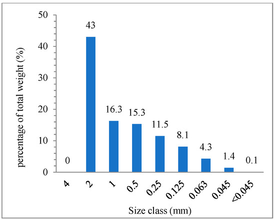 A reduction in shred diameter was observed after grinding on a Brabender Mixer for 15 min. The largest grain diameter was less than 4 mm. The sieve analysis (Figure 2) showed that the grounded material’s largest fraction (43% by weight) was the grains with a diameter bigger than 2 mm. The weight percentage of the grains in diameter between 2 mm and 1 mm was 16.3%. The total weight percentage of the rubber shred with a diameter lower than 1 mm was 40.7%.