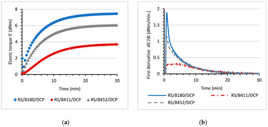 (a) The elastic torque S′ (dNm) as a function of time, (b) the first derivative of elastic torque dS′/dt (dNm⋅min−1) as a function of time; each for various RS/TPE/DCP blends.