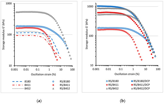 The storage shear modulus G′ as a function of oscillation strain (%) for neat TPE and RS/TPE blends (a); for cured RS/TPE/DCP blends (b). Condition of measurements: angular frequency 10 rad⋅s−1, temperature 25 °C.