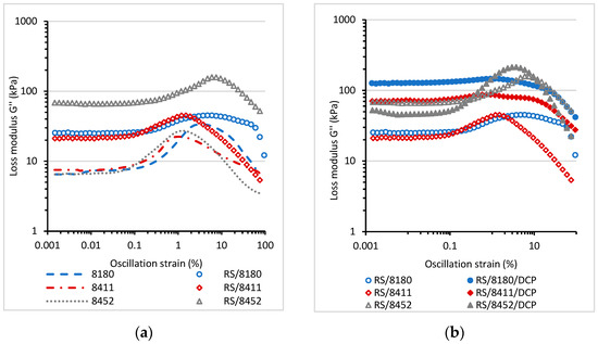 The loss shear modulus G″ as a function of oscillation strain (%) for neat TPE and RS/TPE blends (a) and cured RS/TPE/DCP blends (b). Conditions of measurements: angular frequency 10 rad⋅s−1, temperature 25 °C.