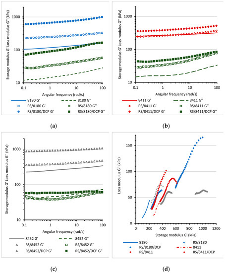 Dependence of the storage modulus and loss modulus of Engage 8180, RS/8180 and RS/8180/DCP blends (a); Engage 8411, RS/8411 and RS/8411/DCP blends (b); Engage 8452, RS/8452 and RS/8452/DCP blends (c) as a function of angular frequency and (d) Cole-Cole plot for the samples.