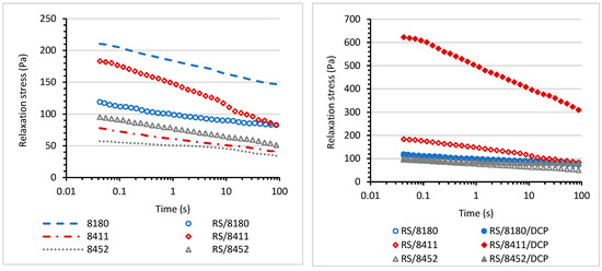 The applied stress during relaxation measurements results in relaxation stress. It can be dissipated or stored in deformed chains that are not able to retract. Thus, the crosslinking prevents the rearrangement of the chains and can restrict the dissipation of the energy during deformation. The homogeneity and the compatibility of the interphase morphology can also influence the dissipation of the energy. The RS/TPE and RS/TPE/DCP blends showed typical relaxation behavior, initially fast stress decay that slowed down with time (Figure 7). Two straight lines of unequal slops were observed for stress relaxation plots of RS/TPE and RS/TPE/DCP blends, indicating various relaxation mechanisms at shorter and longer times. The highest initial stress was observed for the RS/8411/DCP blend indicating the higher energy stored in the deformed structure. Moreover, this blend also showed faster stress decay. The decay of stress at various times of relaxation may occur due to the reorientation of small segments or domains of both components of the blends. In contrast, the further stage of relaxation may be related to a long-range rearrangement of molecular chains at the interphase between components of the blend, or the failure of bonding at the interphase.