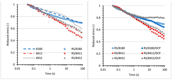 The relaxation plots were normalized with respect to the initial stress to estimate the differences between the degrees of relaxation of the RS/TPE blends. The normalized curves are presented in Figure 8. The type of thermoplastic elastomer used to prepare the RS/TPE blend has a meaningful influence on the degree of relaxation. At the shortest time of relaxation, up to one second, the stress decay was similar for all blends, even cured ones, but the differences in stress decay for various blends were visible at longer times. A stronger reduction in relaxation stress was observed for rubber shred blends based on 8452 and 8411 thermoplastic elastomers as compared with RS/8180 blend. As expected, curing both RS/8411 and RS/8452 blends led to a slower relaxation speed and lower stress decay during the same period of time. Curing and its influence on the relaxation speed were clearly visible for the RS/8452 blend. Probably after curing, a higher number of crosslinks was formed in the 3D network, thereby restricting the mobility of polymeric chains compared with the RS/8452/DCP blend. Curing did not significantly influence the relaxation behavior of the RS blends based on the 8180 thermoplastic elastomer.