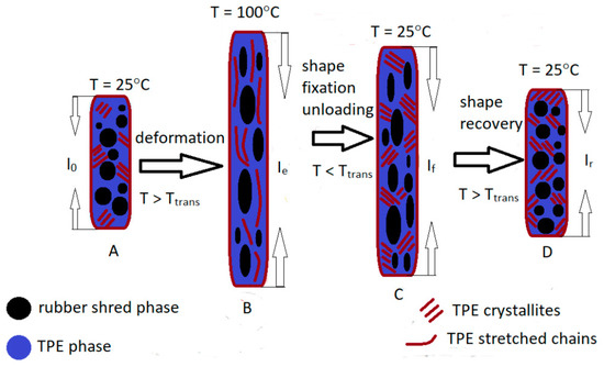 The shape memory effect was studied while stretching the sample according to the scheme shown in Figure 10. At room temperature (A) in the RS/TPE blends, the rubber phase is dispersed in the TPE phase that contains amorphous and crystalline areas. During the stretching of the blend mixtures at the temperature of 100 °C, chains of both soft (rubber dust) and hard (TPE) phases orient themselves in the direction of stretching (B). After cooling down to room temperature, the TPE crystallizes, limiting the mixtures’ relaxation after the stress is released and stabilizes the programed shape (C). Upon reheating without stress (crystallite melting), the chains loosen again and return to their original undistorted shape, and upon cooling, they crystallize again (D). The higher the content of the crystalline phase in the sample, the better the stability of both the original and the desired (predetermined) shape. Therefore, the higher the content of the crystalline phase, the better the shape fixity (F) will be. The shape fixity factor F indicates the durability of the given shape of the material. The higher it is, the more durable the shape given to the material and the most like the original pattern.