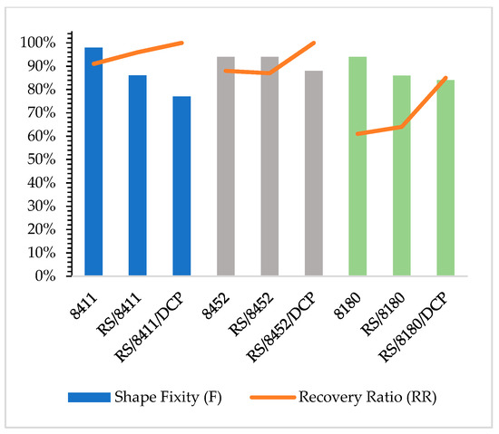 After crosslinking, a further decrease of shape fixity F factor was observed; however, the shape fixity level remained in an acceptable range from 77% (RS/8411/DCP) to 88% (RS/8452/DCP). The curing process led to a decrease of flexibility that resulted in lower shape fixity F values and a higher recovery ratio (RR), in range from 85% (RS/8180/DCP) to 100% (RS/ RS/8452/DCP).