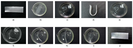 A series of photos demonstrating the shape memory behavior of the thermoplastic elastomers Engage 8411: (a) Initial sample; (b) softening the sample in hot water; (c) fixation of a temporary shape by the emergence in cold water; (d) fixed temporary shape; (e) immersing the temporary sample in hot water to restore its initial shape; (f–i) recovering of the original sample shape at various stages; (j) sample after final recovery.
