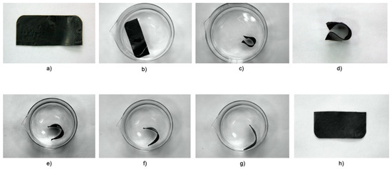 A series of photos demonstrating the shape memory behavior of RS/8411/DCP crosslinked blend: (a) Initial sample; (b) softening of the sample in hot water; (c) fixation of a temporary shape by the emergence in cold water; (d) fixed temporary shape; (e) immersing the temporary sample in hot water to restore its initial shape; (f,g) recovering of the sample shape at various stages; (h) sample after final recovery.