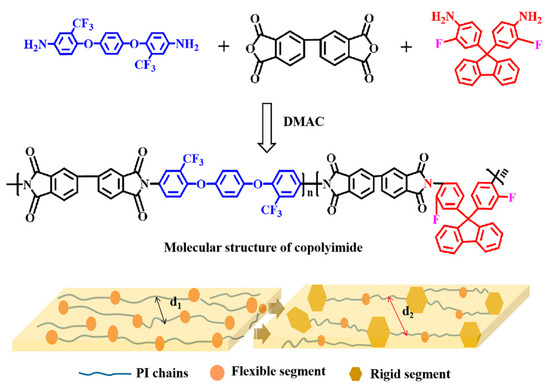 Biphenyl-3,3′,4,4′-tetracarboxylic dianhydride (BPDA) was purchased from Beijing Honghu United Chemical Products Co. Ltd., Beijing, China and purified via sublimation under reduced pressure for 24 h. 9,9-Bis(3-fluoro-4-aminophenyl) fluorene (FFDA) was purchased from Beijing Huawei Ruike Chemical Co. Ltd., Beijing, China, 1,4-Bis(4-amino-2-trifluoromethylphenoxy) benzene (6FAPB) was obtained from Beijing Yinuokai Technology Co., Ltd., Beijing, China, and N, N-dimethylacetamide (DMAC) was provided by Sino Pharm Group Chemical Reagent Co. Ltd., Shanghai, China.