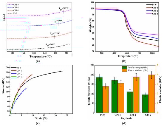 (a) DSC, (b) TGA, and (c) stress–strain curve of the CPI films. (d) Histogram of tensile strength and elastic modulus.