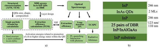 (a) Schematic diagram summarizing the steps used in this work (b) Scheme of layer design of the investigated structure with InAs/InP QDs on distributed Bragg reflector. Nominal (designed) thicknesses of the respective layers are presented on the right-hand side.