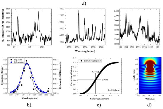(a) Exemplary photoluminescence spectra used for extraction efficiency measurements (non-resonant pulsed excitation with power corresponding to saturation conditions) (b) Experimental (black squares) and calculated (blue dots) extraction efficiency for NA = 0.4 (left axis) with Gaussian fits (solid lines); right axis–PL intensity under non-resonant pulsed excitation with saturation power measured on SSPD at 5 K (whole spectrum on Figure 3; (c) calculated extraction efficiency vs. numerical aperture of the first lens collecting the optical signal for source wavelength of 1535 nm for which maximal extraction efficiency was obtained; NA = 0.4 corresponding to experimental conditions marked with solid black lines; (d) calculated distribution of electromagnetic field for 1535 nm wavelength, for which maximal extraction efficiency was obtained; the intensity of electric field component is color-coded and presented in a logarithmic scale; the calculations are performed for numerical aperture of 0.4.