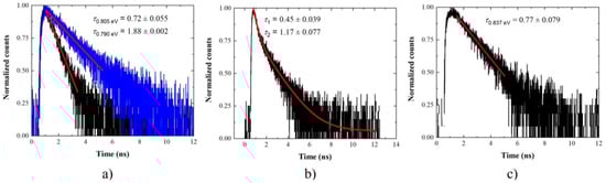 A similar study for 72 emission lines in 4 mesas was performed on the patterned sample. Similar types of behavior were observed (Figure 5). This time mono-exponential decay with a characteristic lifetime in the range of (0.39–2.65) ns was measured for 54% of emission lines. Two-component exponential decay with fast and slow components in the range of (0.27–2.01) ns and (0.52–4.15) ns, respectively, for 46% of cases. Again, positive correlation between the two times was seen. A measurable rise time was detected for 21% of the cases, with the rise times up to 0.13 ns. This seems to be similar for planar and patterned sample. The main difference is much larger contribution of the cases with a second PL decay time component. As far as the lifetime dispersion is considered (Figure 6c), it is clear that a subensemble of QDs, corresponding to a narrower emission range, was investigated. There is no clear energy dependence of the PL decay lifetime, but the distribution of lifetimes for a given energy is much broader than in the case of a planar structure. This difference might be related to the fact that other excitonic complexes are allowed in the case of the patterned sample. Excitonic complexes can differ substantially in the radiative lifetime. Some of them might not be present or at least not measurable in the case of the planar sample. Different dominant charge state might arise from, e.g., roughness in mesa sidewalls acting as charge traps in the vicinity of QDs. These might deplete or support a given type of carrier, increasing the probability of forming charge excitonic complexes. For the case of the investigated QDs in mesa structure, it was shown that the emission is of mainly charged character [92]. Similar studies were not carried out for the planar structure. This would require combination of a complex experimental methods and the need for repeating various experiments on the same QD. This was not possible for the planar structure. Additional carriers that can be trapped on the etched mesa sidewalls provide a charge environment with stronger fluctuations closer to the QD. Additional carriers facilitate the formation of charged excitonic complexes in the QDs and this will depend on the position of the QD. These effects are of random character and not directly related to the energy spectrum of a QD and therefore not directly linked to their emission energy. The reduction of the PL decay lifetime might also result from a nonradiative recombination channel (e.g., Auger-type processes with carriers trapped on mesa sidewalls) or Purcell enhancement of the emission in the case of mesa photonic structure [108]. In the case of random position of the QD in the mesa structure due to the non-deterministric fabrication processs, it is also possible to extend the PL decay lifetime (Purcell factor is lower than 1).