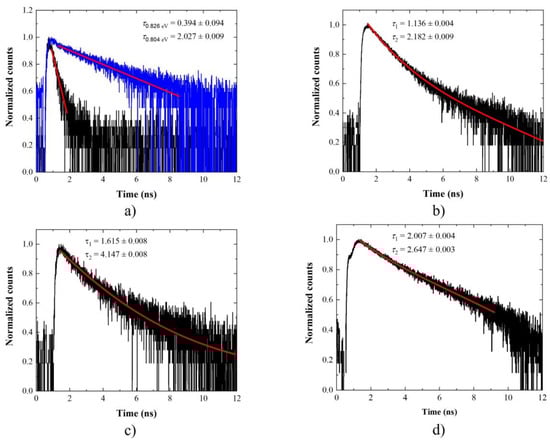 Normalized low-temperature (T = 4.5 K) and low-excitation time traces of exemplary single emission lines from patterned structure with InAs/InP QDs showing distinct behavior: (a) mono-exponential decay with much different PL decay times; (b,c) two-component exponential decay; (d) decay with initial rise time together with exponential fits to experimental data.