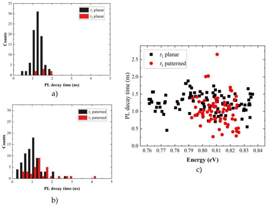 Carrier lifetime distribution for (a) planar and (b) patterned sample with initial PL decay time τ1 marked in black and longer PL decay time τ2 marked in red. (c) PL decay lifetime τ1 dispersion for planar (black) and patterned (red) sample.
