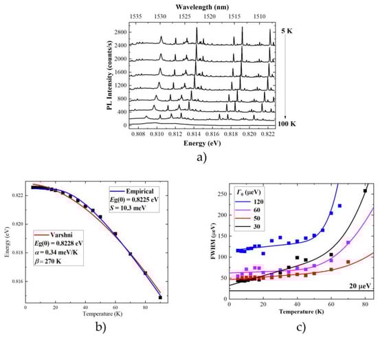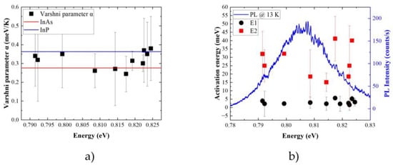All the parameters (emission energy, FWHM, and intensity) are determined from a Gaussian fit to experimental data performed for individual emission lines. Emission intensity is evaluated in terms of integrated intensity (peak area), so the change in the lineshape (its broadening) is included. The emission energy for all the lines is almost constant up to 20 K, and then it decreases strongly. The main effect is related to the temperature dependence of the semiconductor bandgap energy. It originates from thermal expansion of the crystal lattice and the interaction of optical excitations with phonons. Fitting this dependence with the phenomenological Varshni formula shows discrepancies in the low and intermediate temperature range. This is typical for the low-dimensional structures [98] and points out that the changes in the energy bandgap are not the only effect influencing the emission energy. The determined α parameters are in the range of (0.24–0.38) meV/K (Table 1). These are in between the values known for bulk InAs (0.276 meV/K) and InP (0.363 meV/K) [117], respectively. This suggests that As-P intermixing is present in the investigated nanostructures. However, no quantitative conclusions can be derived based on these measurements, as the experimental uncertainty is too large. Also, no clear dependence between the α parameter and the emission energy can be observed. This suggests that the composition of the QD material is not solely determining the emission energy. However, again, the large experimental uncertainty might hinder the actual dependence. The β parameter is much larger than in bulk material, which is typical for systems with lower dimensionality [118]. It is also not very reliable when the emission cannot be observed up to the room temperature. One has to keep in mind that difference in the thermal expansion of different materials within the heterostructure influence the depth of confining potential. This changes the single-particle levels, therefore, changing the emission energy on top of the band edge variation. Microscopic theories providing descriptions of the bandgap energy changes with temperature based on analysis of the electron-phonon interactions allow for better agreement between the data and the fitted curve. This shows that observed dependences can be reproduced if interaction with phonons is described properly (Figure 7b). The experimental data were fitted with the following formula [119]: