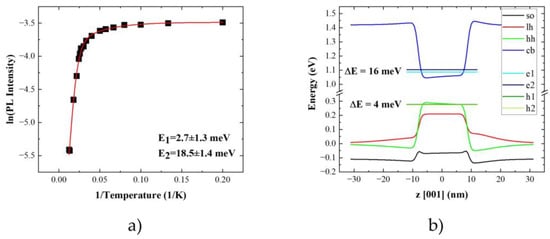 where is the initial intensity at low temperature and is the number of quenching mechanisms. The activation energy (or energies) together with efficiencies Ci of the respective processes are determined. These activation energies are around 25 meV and 3 meV for the higher and the lower efficiency process, respectively (Figure 8a). These are way too small for the carrier escape to the wetting layer or InP matrix directly. Therefore, they are interpreted as the carrier escape via the higher energy states within the QD. This is highly probable as the QDs are large, and the ladder of states is dense, so many states are confined within the QD. To get a deeper insight into the interpretation of determined activation energies, a single-particle energy spectrum of an exemplary QD was calculated. QD with a ground state transition corresponding to the energy of maximal PL intensity of the QDs’ ensemble was selected as the representative one. The results of the calculations are presented in Figure 8b. The s-p splitting equals to 20 meV and is shared in the relation 1:4 between the valence and conduction band, respectively. This allows us to interpret the lower/higher activation energy as a promotion of holes/electrons to the higher states within the QD. The determined activation energies do not show a clear dependence on the QDs’ emission energy (Figure 9b). This could be related to the fact that investigated examples are within a rather narrow energy range of 30 meV. It might be too small to reveal emission energy trends in the s-p splitting. Also, the dense energy spectrum can lead to a lack of dependence. Activation to different closely separated states is possible. Similar activation energies for PL quenching processes were previously reported for other InP-based structures emitting at 1.55 μm, i.e., low density InAs/InP quantum-dot-like structures grown by MOVPE [88] and MBE-grown InAs/InGaAlAs/InP QDs [90] as well as strongly elongated quantum dashes [122,130]. In the former, it was interpreted as a carrier escape to the excited state within QD alike our case. The investigated structures are also relatively large, with the height exceeding 9 nm. For quantum dashes, 20 meV was already enough for the electrons to escape directly to the wetting layer.