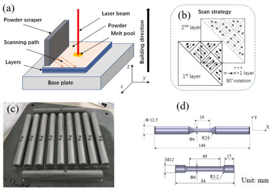 Schematic of selective laser melting Ti-6Al-4V: (a) schematic of part forming; (b) scan strategy; (c) manufactured cylindrical bar; (d) final geometry of LCF and tensile specimens.