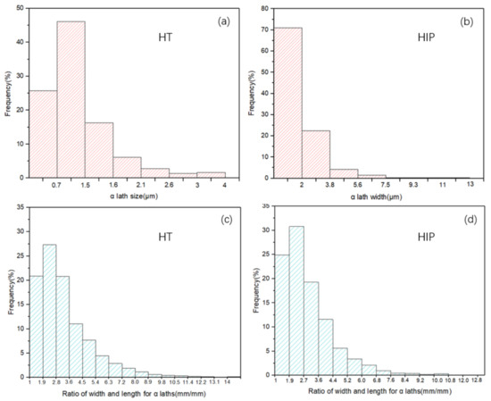 (a,b) -lath sizes of HT-treated samples and HIP-treated samples, respectively, (c,d) Ratio of width and length for HT and HIP sample -laths.