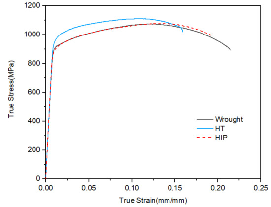 The tensile properties of SLM Ti-6Al-4V specimens in heat treatment (HT) and hot isostatic pressing (HIP) conditions are presented in Figure 6. Traditionally manufactured wrought specimens were used as a comparison. The results are listed in Table 3. All samples had a similar elastic modulus and ultimate tensile strength. SLM samples in HT and HIP conditions had approximately similar yield stress and ultimate tensile strength, being superior to their wrought counterparts. It can be also observed that HIP treatment helped to improve the ductility according to the elongation results, but there was no significant difference between HT and HIP conditions. The wrought specimens had a balanced property with lower ultimate stress but the best ductility.