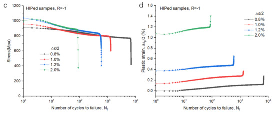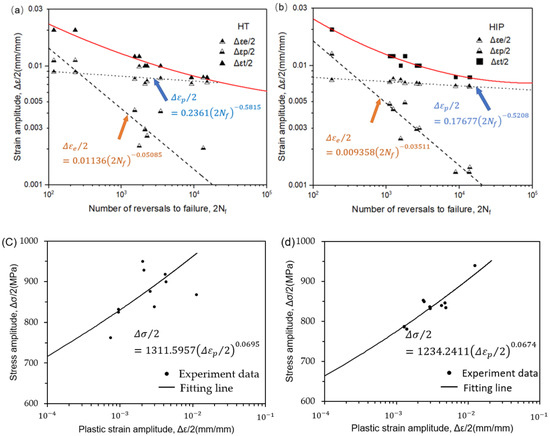Maximum stress and average plastic strain amplitude and at given strain amplitude of HT- and HIP-treated samples under different strain amplitude: (a) maximum stress as a function of number of cycles to failure in HT samples; (b) plastic strain amplitude and Nf of HT samples; (c) maximum stress as a function of number of cycles to failure in HIP-treated samples; (d) plastic strain amplitude and Nf of HIP-treated samples.