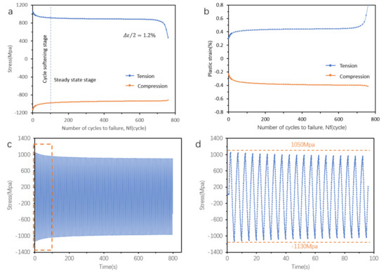 Fatigue process of the HT samples of SLM Ti-6Al-4V: (a) stress evolution over cycles to failure; (b) plastic–strain over cycles to failure; (c,d) stress response of the whole test process and in the initial cycles.