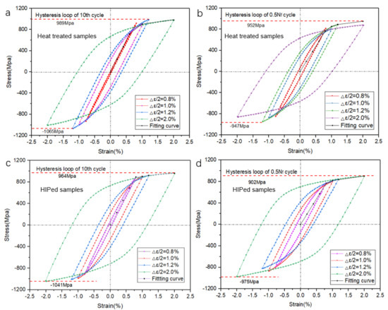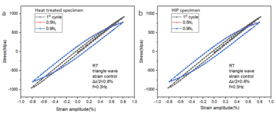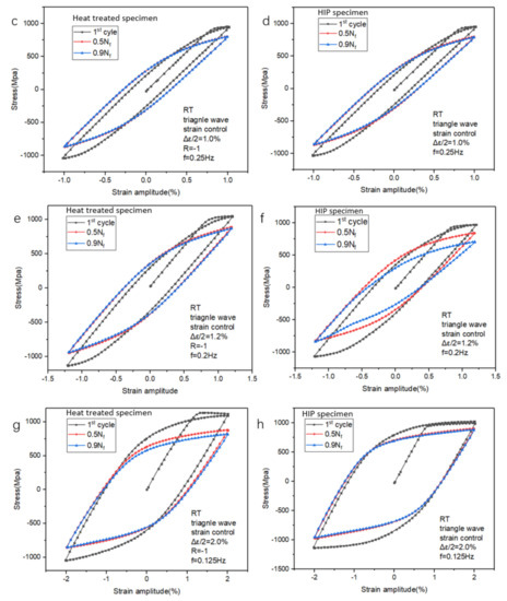 Cyclic softening or cyclic hardening is a general behavior when alloys are subjected to cyclic load. The cyclic softening phenomenon can be seen in Figure 9a–c, shown that the stress feedback decreased when samples were subjected to cyclic strain-controlled load. The detailed cyclic softening behavior of both types of samples at specific cycles under four strain amplitudes (0.8%, 1.0%, 1.2%, and 2.0%) is shown in Figure 10. The stress trend of both types of samples agrees with that of the typical sample (Figure 8). The sizes of the hysteresis loops of both types of samples increased with the increase in strain amplitude from 0.8% to 2.0%. Moreover, the HT and HIP samples had similar behavior [33]. Generally, cyclic softening or hardening behavior is relevant to the initial state of the material [34,35,36,37,38,39,40].