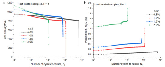 Furthermore, Figure 11 compares the stable hysteresis loops of the 10th cycle and half-life cycle under all strain amplitudes of both types of samples. The increase in strain resulted in an increase in the size of hysteresis loops. The maximum stress at half-life was reduced compared to that at the 10th cycle. The hysteresis loop behavior corresponded to the cyclic softening ratio. To investigate the fatigue behavior, the stress and plastic response to was plotted and analyzed (Figure 12). At multiple strain amplitudes, the maximum stress decreased while the plastic strain increased. This also demonstrates the cyclic softening behavior of the SLM Ti-6Al-4V samples. It is noted that, with the increase in strain amplitude, there was an increase in plastic strain amplitude (< 1.0%). The plastic strain increased throughout the loading process, with damage occurring at an extreme value, as indicated by a sharp jump.