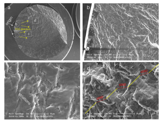 In addition, it was found that there was more than one crack initiation location for both types of samples, and no defect was found close to the crack initiation. A typical fatigue fracture surface of HIP samples at 1.0% strain amplitude was investigated (Figure 15). Similar to typical fatigue fractography, the crack initiated from the surface, and striations could be found in the crack growth area (Figure 15a,b); the propagation steps were also found (Figure 15c,d).