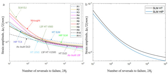 Furthermore, the fatigue of HT samples was slightly higher than that of HIP-treated samples at high strain amplitude, with the gap between both turns increasing with a decrease in strain amplitude. According to the reference data, yield stress plays an important role in LCF properties. Specimens with high yield stress have superior LCF properties, especially at a very-low-cycle fatigue stage; this result can be verified by the data of SLM Ti-6Al-4V ELI (Figure 17a). However, ductility in the form of tensile elongation also plays a major role in LCF properties. SLM Ti-6Al-4V ELI had the highest yield stress (~1015 MPa), but low ductility (~10%), resulting in inferior LCF life at low strain amplitude. In addition, we found that the HT SLM and HIP SLM samples in this research had similar ductility (~17.9% and ~19%) and similar yield stress (~964 MPa and ~913 MPa), resulting in similar fitting curves; clothe slight decrease in yield stress led to superior LCF properties. More evidence of this performance can be seen for the HIP TC4 (ductility ~12.3% and yield stress 872 MPa) and as-built Ti-6Al-4V (ductility ~11% and yield stress 893 MPa). The same performance can also be verified by the as-built DLD (YS 908, EL 3.8%) and HT DLD (YS 957, EL 3.4%) data. Therefore, higher yield stress results in an increase in LCF life at high strain amplitude, and an increase in ductility leads to an increase in LCF life at low amplitudes. These results may have been caused by the HT SLM samples having a finer α-phase (average size 4.93 ± 1 μm) than the HIP-treated SLM samples with a coarser α-phase (average size 8.86 ± 1 μm); these microstructure features can be observed in Figure 3; Figure 4. It can also be concluded that the heat treatment process is essential for an improvement of the fatigue properties of AM Ti-6Al-4V materials.