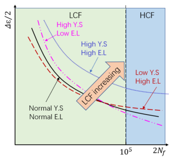 Illustration of the relationship among elongation to failure (EL), yield stress (YS), and LCF curve.