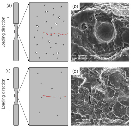 Schematic of internal defects along the fatigue crack propagation of SLM HT and HIP samples: (a) HT samples with pore defects; (b) internal defects on the fracture surface; (c) crack propagation of HIP sample; (d) typical region of fracture surface.