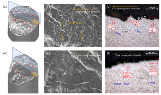 With the increase in crack propagation, the fatigue cracks can penetrate -laths; the intragranular crack propagation can be observed in Figure 20c (HT) and Figure 20f (HIP). Cracks that propagated along the α + β grain lath boundaries can be also observed in the HT crack path (Figure 20c). It is shown that crack tip turned and was deflected more frequently within the finer microstructure of the HT sample, leading to a zig-zag crack path and a rougher fracture surface on the micro and mesoscale.