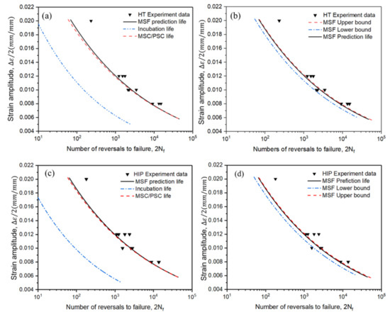 As shown in Figure 21, the fatigue life prediction results of the two heat-treatment processes obtained using the MSF model were plotted. Figure 21a,c exhibit the total fatigue life and the fractions, incubation life, and MSC/PSC life of HT and HIP samples, respectively. Figure 21b,d present the upper and lower bounds of the fatigue life according to experimental data; here, we assumed that the cracks formed and initiated at casting pores of diameter 5 and 500 µm, respectively. Taking the dispersity and the estimation of parameters in the MSF model into consideration, the prediction fatigue life curves showed agreement with the experiment results. However, at a high strain amplitude level ( = 2%), there was a noticeable error between the experimental data and prediction. This is because only one sample was evaluated at high strain amplitude, leading to more unpredictable low-cycle fatigue results. Therefore, the MSF prediction model was deemed acceptable in this research. The upper bound and prediction life adequately fit the experiment data, as we assumed the smallest and largest incubation pore diameters as 5 and 500 µm; thus, actual internal defects or voids of size smaller than 80 µm could have similar effects on the prediction results (Table 7).