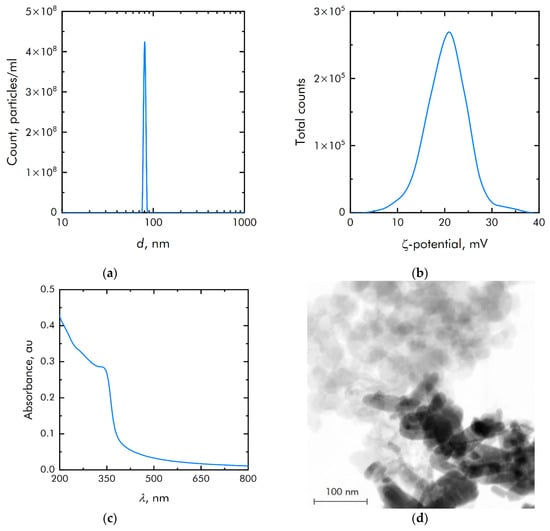 Physicochemical properties of zinc oxide nanoparticles: (a) Concentration and size distribution of zinc oxide nanoparticles; (b) Zeta potential of zinc oxide nanoparticles; (c) Optical absorption of an aqueous colloidal solution of zinc oxide nanoparticles; (d) TEM image of a group of zinc oxide nanoparticles (image used by the authors earlier in other manuscripts).