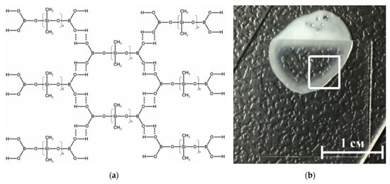 (a) Schematic representation of the structure of the borosiloxane (BS). BS molecules linked through hydrogen bonds; (b) Photography of composite material, part of the sample is under the cover glass.