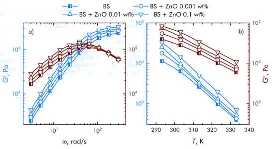 Influence of composite material based on boroxiloxane and zinc oxide nanoparticles on the mechanical spectra; storage modulus—blue symbol, loss modulus—red symbol. (a) The dependence of the change in the mechanical spectra of composites on the rotation speed. (b) Temperature dependence of the change in the mechanical spectra of composites.