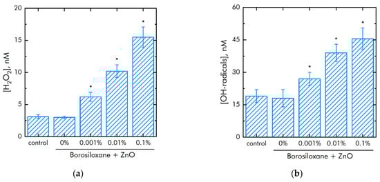 Effect of composite material containing borosiloxane and ZnO nanoparticles on the generation of reactive oxygen species: (a) Formation of hydrogen peroxide (2 h, 40 °C); (b) Generation of hydroxyl radicals (2 h, 80 °C); * indicate a significant difference at 5% level in comparison with the control (p < 0.05). Data are presented as mean values and standard errors.