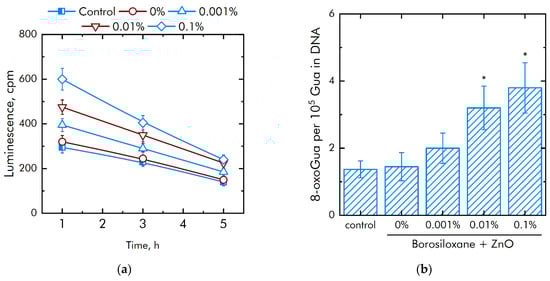 Effect of composite material containing borosiloxane and ZnO nanoparticles on the generation on biomacromolecules damage: (a) Formation of long-lived reactive protein species (2 h, 40 °C); (b) Generation of 8-oxoguanosine (2 h, 45 °C); * indicate a significant difference at 5% level in comparison with the control (p < 0.05). Data are presented as mean values and standard errors.
