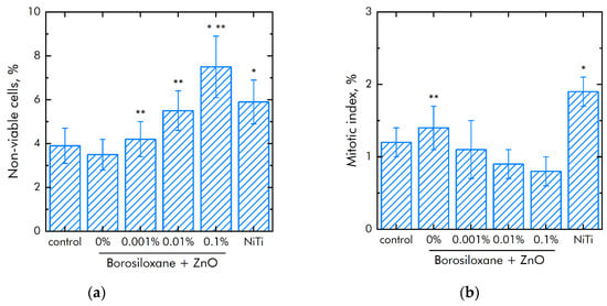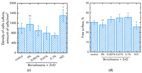 The effect of a composite material based on borosiloxane and ZnO NPs on the viability of mammalian cells was studied (Figure 8a). The number of non-viable cells grown on control substrates and culture plastic did not exceed 4%. Approximately the same number of non-viable cells was observed when grown on a composite material based on borosiloxane without ZnO NPs or contains 0.001% nanoparticles. At the same time, when nitinol is used as a substrate, the number of non-viable cells was almost 50% higher (about 6%). Proportions of non-viable cells were about 5.5% and 7.5% at 0.01% and 0.1% ZnO NPs concentrations in nanocomposite, respectively.