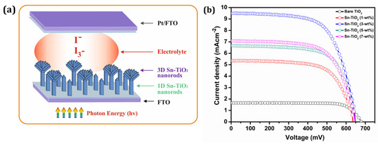- Ni, S.; Guo, F.; Wang, D.; Jiao, S.; Wang, J.; Zhang, Y.; Wang, B.; Feng, P.; Zhao, L. Modification of TiO2 Nanowire Arrays with Sn Doping as Photoanode for Highly Efficient Dye-Sensitized Solar Cells. Crystals 2019, 9, 113. [Google Scholar] [CrossRef]