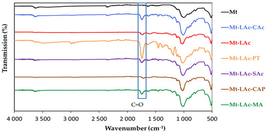 The results of the elemental analysis tests are presented in Table 1. They showed that all tested samples contained an organic segment in the Mt structure. The raw, sodium Mt contained 0.9% wt. carbon and 1.56% wt. of hydrogen, while the Mt modified with lactic acid oligomers (Mt-LAc) and other compounds contained from 12.79% to 21.43% wt. carbon and 2.05% to 3.37% wt. hydrogen. The composite, where the modifying substance was the reaction product of lactic and citric acid (Mt-LAc-CAc), contained 13.3% wt. carbon and it was about 3–4% less than in the case of modification with the lactic acid oligomer alone. The Mt-LAc-PT contained 14.8% wt. carbon and 2.25% wt. hydrogen. In the case of montmorillonite modified with the reaction product of lactic acid and maleic anhydride (Mt-LAc-MA), the carbon content in the isolated solid product was 21.4% by weight, which, assuming that the chains incorporated in the mineral have a composition similar to the expected one, allowed us to estimate that the organic part accounted for about 46% wt. of the composite. This was distinctly more than in the other previously described composites. The carbon content of the Mt-LAc-CAP was 19.99% wt. and likewise it was one of the highest values. The isolated composite from Mt-LAc-SAc contained on average 12.8% wt. carbon and it was the lowest value of all modified Mt. This could be due to the fact that stearic acid was the most hydrophobic among the modifying substances, and due to the reaction taking place in an aqueous environment, it had the lowest possibility of being incorporated into the Mt structures.
