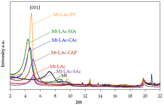 In order to obtain organophilic montmorillonites with lactic acid oligomers and other compounds, condensation reactions of lactic acid in the presence of sodium montmorillonite were performed, as well as reactions of lactic acid with other compounds of hydrophilic or hydrophobic nature. Because one could expect that larger LAc oligomers should encounter difficulties integrating into the structure of Mt, we selected such processing conditions (e.g., molar ratio of reagents, time and pressure on each stage of the process), as to promote the formation of small LAc oligomers having an average molecular mass less than 1000 g/mol. Our previous studies on the LAc copolymers [29,30,31,32] indicate that, under such processing conditions, condensation of LAc in the absence of Mt produces LAc oligomers with molar masses 500–1000 g/mol (reactions with CAc, PT, or without additional reagent), or 260 g/mol (condensation with MA).
