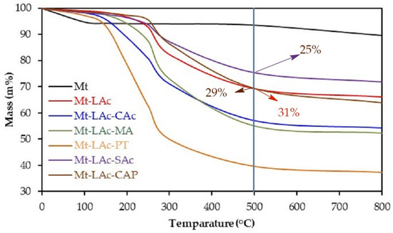 During annealing of the lactic acid oligomers at an elevated temperature, apart from condensation, depolymerization also occurred, this resulted in the elimination of the lactide. It was found that such a process also worked on the obtained composites. As a result of annealing for 10 h at 180 °C under atmospheric pressure, in samples containing about 34%wt. of organic material, the carbon content dropped from 17.5% to 12.1%wt. Thermogravimetric analyses of Mt-LAc showed that, during annealing up to 500 °C, they lost 31–38% of their mass—Figure 3. It could be assumed with high probability that in this temperature range all organic matter and water absorbed were removed from the composite as a result of progressive polycondensation. The amount of absorbed water, which was removed mainly during annealing up to 100 °C was 1–2% and was distinctly lower than in the solely Mt samples. This helped to confirm the conclusion drawn from the observation of FTIR spectra about the reduction of the hydrophilic properties of Mt after introducing lactic acid oligomers into its structure. It’s likely that a small amount of the absorbed water was also released at the higher temperatures. Although it can be assumed that in the range of 100–500 °C the main processes that took place were condensation with water separation, lactide elimination, and thermal decomposition of the remaining oligomers. The total weight loss in this range (30–36% wt.) was consistent with the expected organic material content determined on the basis of the carbon content. The weight loss temperature profiles for different samples with different organic material content were different, which may have been because some of the chains were absorbed outside of the Mt particles and degraded earlier than the chains between the mineral layers, which delayed the flow of heat.