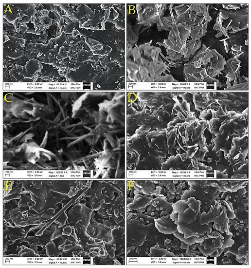 SEM images for montmorillonites: (A)—Mt, (B)—Mt-LAc, (C)—Mt-LAc-CAc, (D)—Mt-LAc-MA, (E)—Mt-LAc-PT, (F)—Mt-LAc-SAc.