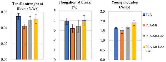 Tensile strength of fibers, elongation at break, Young modulus for PLA, PLA-Mt, PLA-Mt-LAc and PLA-Mt-LAc-CAP.