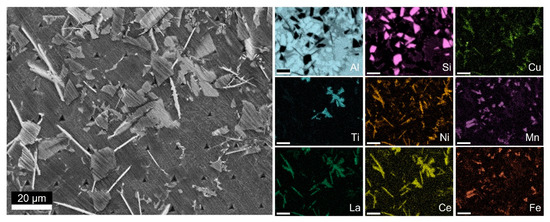 In particular, Wang et al. [24] reported the formation of nanoscale (La,Ce)-based phases in an Al-Si-Mg-Zn alloy. The rapid solidification in high-pressure die-casting determines the presence of nano-precipitates in the Al matrix in the as-cast condition. The thermal stability of these phases improves the high-temperature performance and is not affected by heat treatment.