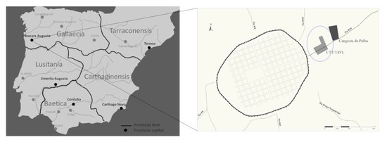 Location of the studied area of Via XVII necropolis in the Roman urban layout, on the Iberian Peninsula. Adapted from [6,17].