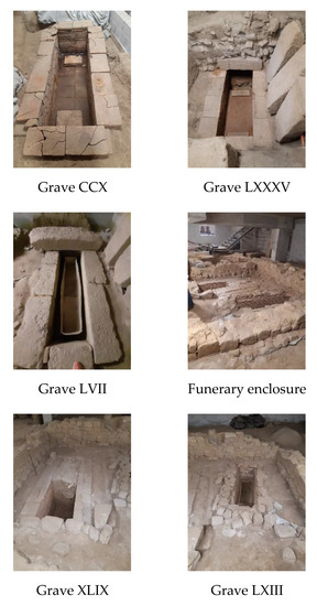 Nowadays, the only nucleus of a necropolis accessible in Braga occupies an area of reduced dimensions, in which five burial graves were discovered, identified (from west to east, and from north to south) as LXIII, XLIX, CCX, LXXXV and LVII, presenting differentiated constructive orientations and techniques, dated from the IV to VII centuries. There is also a rectangular enclosure built with masonry walls, which partially overlaps the graves XLIX and LXIII, and a stone masonry wall oriented SE–NO, which seemed to delimit the area to the west [20] (Figure 2). The funerary enclosure was assumed to be constructed between the V and VII centuries, later than the graves XLIX and LXIII, from the IV to V centuries. The chronology was attributed through the relative dating methodology, based on the analysis of the materials collected in the intervention, namely ceramics, glasses and metals, considering their evolution according to the stratigraphic levels [21].