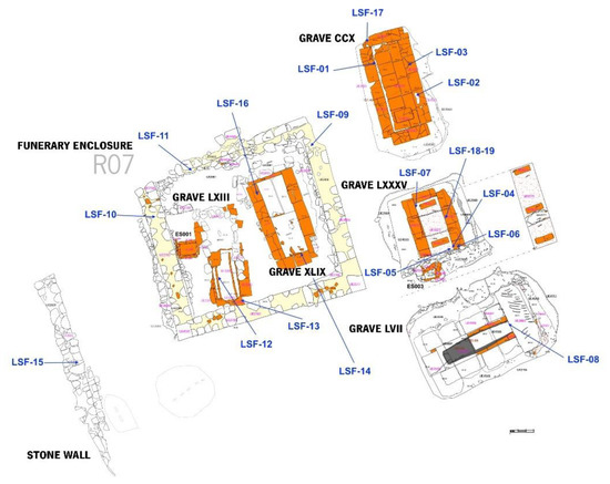 A schematic representation of the graves LXIII, XLIX, CCX, LXXXV and LVII, the funerary enclosure and the stone wall can be found in Figure 3.